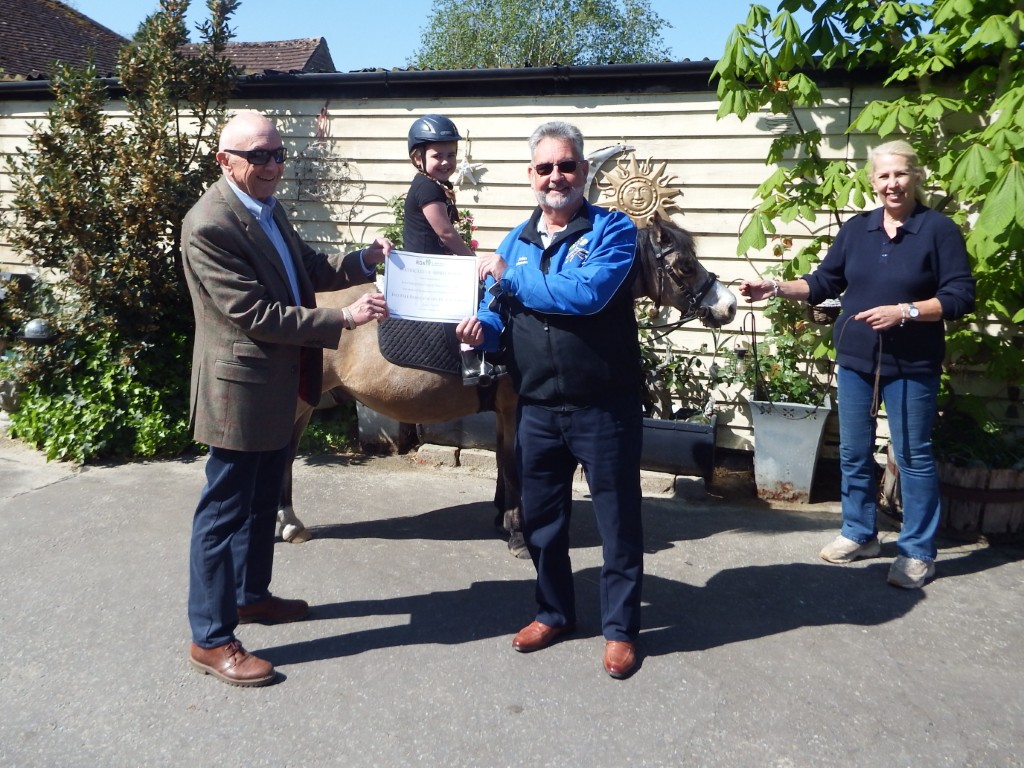 It’s the Chinese year of the horse which inspired the East Grinstead Target Shooting Club to choose us to benefit from their fun shoot day in February. They donated a very welcome £377 to us and their Chairman and ours got together today to hand over a Certificate of Thanks. John Mason and James Baxter posed in front of one of our ponies and riders for the ‘shot’!